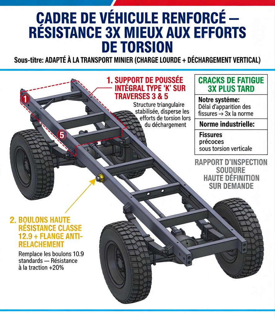 3.Pour résoudre le problème critique des fissures de torsion dans les châssis de transport minier, Qingdao Zhonghao a utilisé l'analyse par éléments finis (FEA) afin d'optimiser avec précision la structure du châssis. L'installation de supports de poussée de type K sur les troisième et cinquième traverses et le remplacement des boulons par des boulons haute résistance anti-desserrage de grade 12.9 ont permis de renforcer considérablement la résistance à la torsion. Les essais sur le terrain démontrent que l'apparition de fissures de fatigue métallique dans le châssis est désormais retardée de trois fois par rapport aux conceptions conventionnelles. De plus, des rapports d'inspection de soudure haute définition sont fournis, ce qui améliore considérablement la durabilité dans les applications minières et démontre une solide maîtrise technologique.